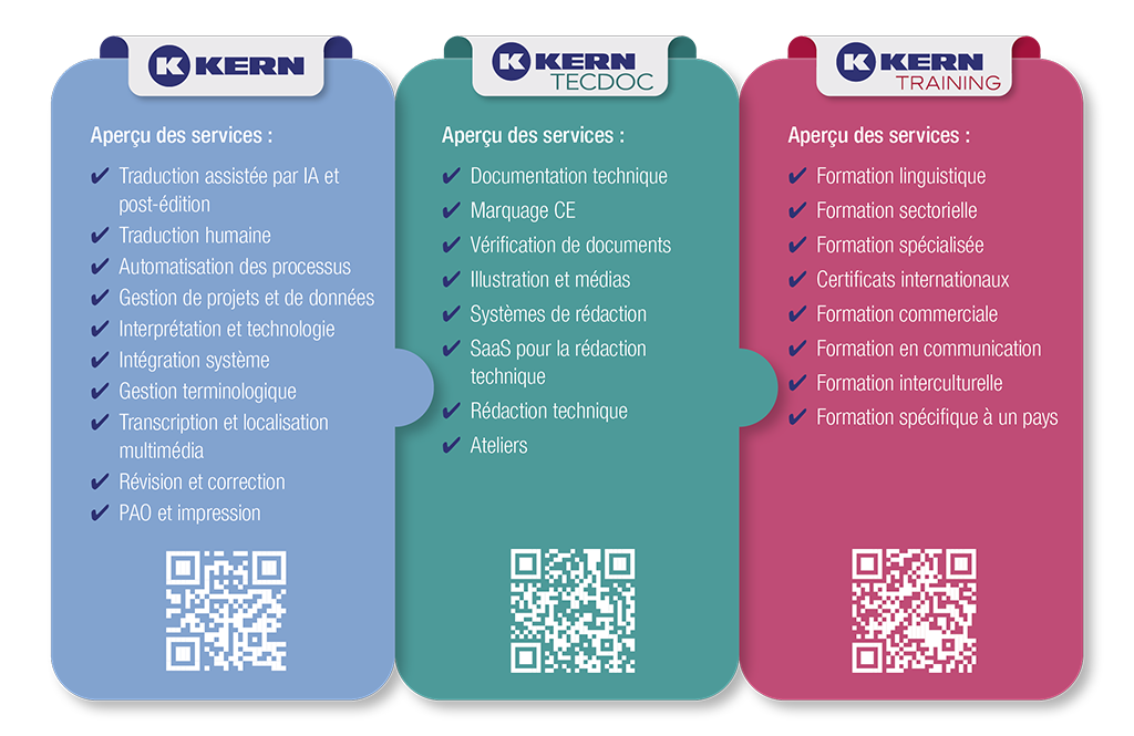 Fort de plus de 50 ans d'expérience et de plus de 30 000 clients, le groupe KERN est synonyme de compétence et de fiabilité dans le domaine de la communication internationale. Notre mission est de vous proposer des solutions rapides, de haute qualité et rentables. Pour cela, nous allions expertise sectorielle, experts en communication de langue maternelle et excellence technique. Avec plus de 45 sites à travers le monde, nous sommes proches de nos clients. Dans le domaine de la formation, plus de 35 000 participants développent leurs compétences linguistiques et leur aisance dans les relations internationales. Ensemble, nous rendons la coopération mondiale claire, sûre et efficace.