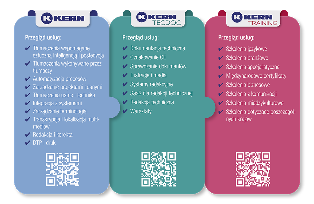 Dzięki ponad 50-letniemu doświadczeniu i ponad 30 000 klientów Grupa KERN jest synonimem kompetencji i niezawodności w komunikacji globalnej. Naszą misją jest oferowanie Państwu szybkich, wysokiej jakości i ekonomicznych rozwiązań. W tym celu łączymy kompetencje branżowe, ekspertów ds. komunikacji będących native speakerami oraz doskonałość techniczną. Dzięki ponad 45 oddziałom na całym świecie jesteśmy blisko naszych klientów. W obszarze szkoleń ponad 35 000 uczestników kursów rozwija kompetencje językowe i pewność siebie w kontaktach międzynarodowych. Razem sprawiamy, że globalna współpraca staje się przejrzysta, bezpieczna i skuteczna.
